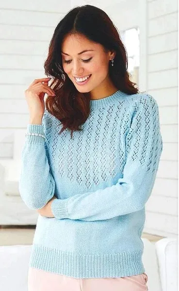 Вязаный спицами свитер-реглан с ажурной кокеткой.