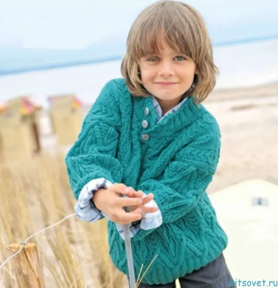 Для вязания узорчатого свитера для мальчика Вам потребуется: 400 (500) 600 г бирюзовой пряжи Merino-Extrafein (100% шерсти, 125 м/50 г); 3 пуговицы; спицы № 4 и № 4,5; круговые спицы № 4.