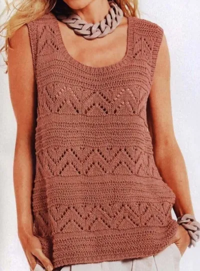 Комфортный летний топ из хлопковой пряжи цвета карамели выполнен несложным ажурным узором и горизонтальными протяжками. Летний ажурный топ спицами для женщин, описание и схему см. далее.