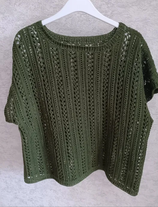 Джемпер состоит из переда и спинки с цельными рукавами. Выполнен в технике поперечного вязания.
