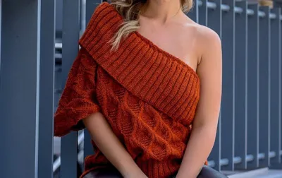 Эффектный асимметричный свитер кирпично-рыжего цвета. Оригинальная модель с оголённым плечиком и широким воротом-хомутом.
