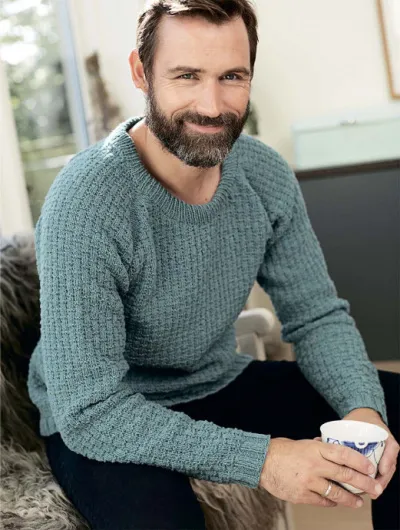 Спинка и перед до пройм вяжутся единым полотном структурным узором на круговых спицах. Рукава вяжутся отдельно.