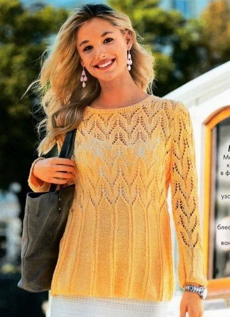 Красивый связанный спицами пуловер в форме трапеции подкупает эффектными узорами, которые выгодно смотрятся благодаря пряже нежного жёлто ванильного цвета, с шелковистым блеском.