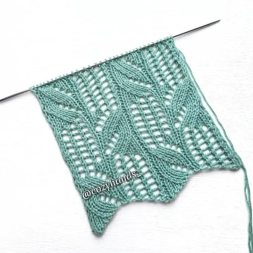 5, 13 ряд: кром.п., * 1 изн.п., 2 п. провязать вместе 1 лиц.п. с наклоном влево, 1 накид, 2 п. провязать вместе 1 лиц.п. с наклоном влево, 1 накид, 2 п. провязать вместе 1 лиц.п. с наклоном влево, 1 накид, 1 лиц.п., 1 изн.п., 2 лиц.п., 1 накид, 2 лиц.п., 2 п. провязать вместе 1 лиц.п. с наклоном влево, 1 лиц.п.,* 1 изн.п., кром.п