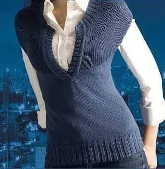 Сборка. Выполнить плечевые и боковые швы. Для планки горловины переда набрать справа по краю выреза 60 п. и связать 1 см лицевой гладью. Затем связать 1 ряд следующим образом: * 1 накид, 2 п. вместе *; повторять от * до * до конца ряда. Продолжить вязание резинкой 2/2. На общей высоте 3 см закрыть петли по рисунку. Левую планку вязать аналогично. Наложить правую планку на левую и пришить внизу выреза горловины потайными стежками