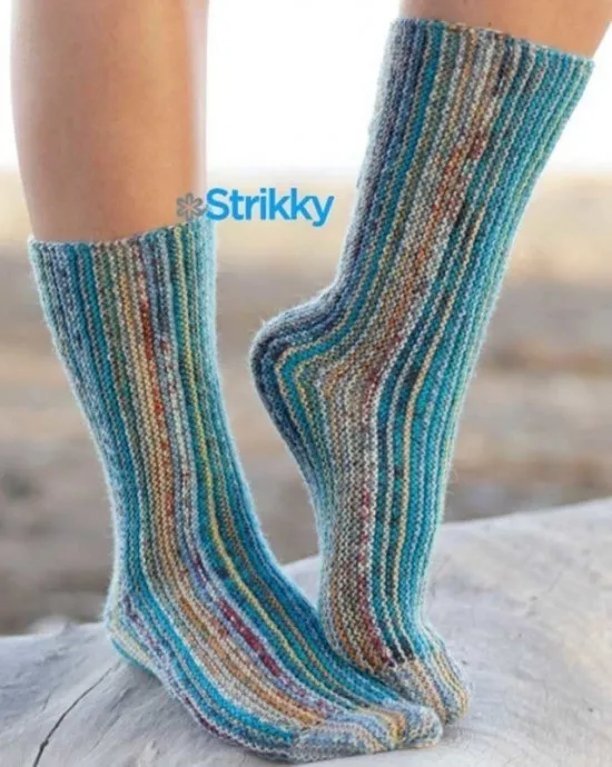 Основной узор – платочная вязка (пл/в). Цветовая гамма изделия переменная, создаётся чередованием двух меланжевых нитей, среди которых непременно присутствуют сине-бирюзовые оттенки. Не зря же название модели носков – «Ocean View», или «Вид на океан».