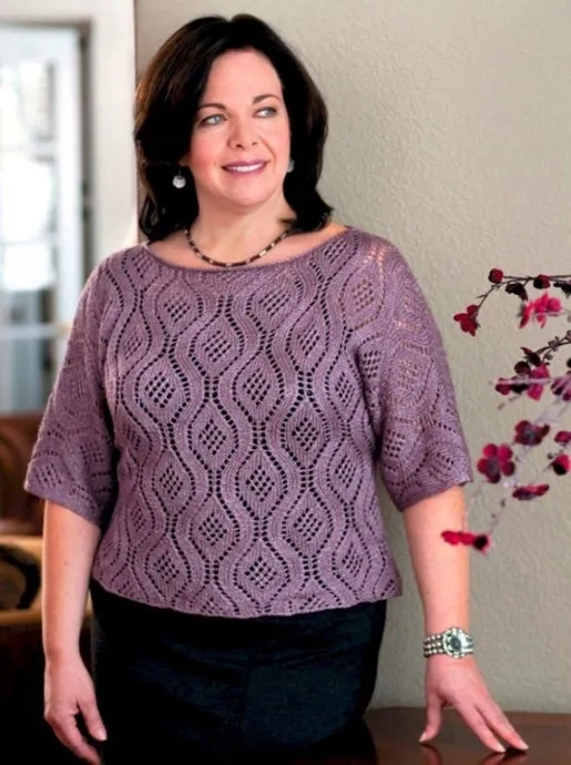 Короткий пуловер с вертикальным ажурным узором (большие размеры)