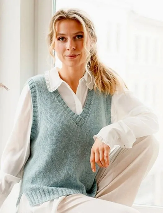Безрукавка из пряжи DROPS Sky вяжется лицевой гладью и резинкой, имеет V-образный вырез горловины и разрезы по бокам.
