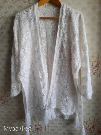Привет, друзья! Сочинила и связала накидку-кардиган. Пряжа: королевские пайетки на хлопке - 350г (330г в 100м) и тонкий мохер Ализе (500м в 100г) - 250г, вязание в две нити. Всего - 600г. Спицы №4.