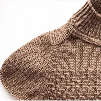 При правильном расчете хорошо садится по фигуре, а благодаря тому, что все детали вяжутся одновременно одним полотном, его можно примерять в процессе работы, что позволяет вовремя скорректировать возможные ошибки, длину и ширину изделия.