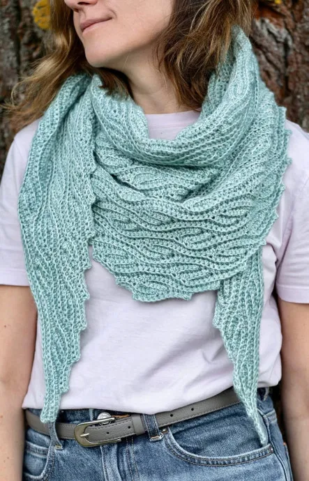 Шаль «Кудрявые веточки» вяжется сверху вниз укороченными рядами, начиная с самой широкой стороны. Длина шали регулируется.