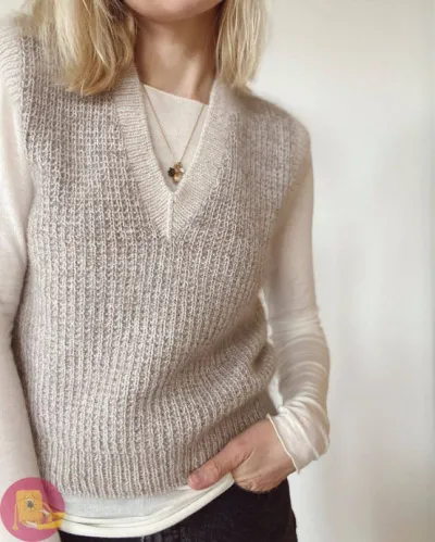 Создаёт мягкую, воздушную фактуру. Жилет выглядит женственно и нежно, идеально подойдёт для многослойных образов. Важно: сочетайте мохер с более стабильной нитью, чтобы жилет не вытянулся.