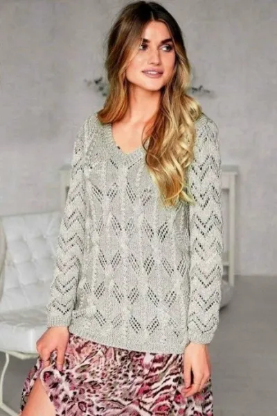 Изысканная шелковая пряжа нейтрального оттенка обладает легким блеском. Ажурные ромбы с «косами» на переде и спинке и зубчатый узор рукавов - типичный образец ручной работы. Без сомнения, этот пуловер станет настоящим украшением вашей весенней коллекции.