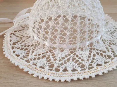 После высыхания шарик убираем, получилось очень легкая, ажурная шляпка. Чтобы она не растягивалась при носке и для украшения продеваем ленту.