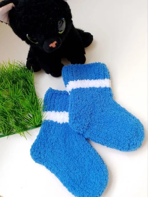 Я вязала их на спицах №3, в две нити — так полотно получается плотнее и лучше держит форму. У Softy нет классической скрутки, поэтому важно не затягивать петли, чтобы они ложились ровно. Узоры здесь не нужны: сама текстура пряжи создаёт эффектный «плюшевый» вид. Простая резинка по верхнему краю помогает носочкам хорошо сидеть на ножке, а гладь по стопе делает их удобными в носке.
