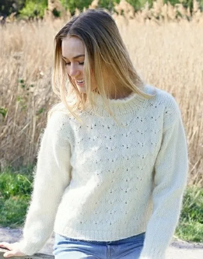 Тело вязать по кругу на круговых спицах снизу вверх. Разделить деталь на перед и спинку в районе пройм и вязать дальше их по отдельности поворотными рядами. Рукава вязать по кругу на чулочных/коротких круговых спицах. Сшить все детали между собой и в конце связать воротник.