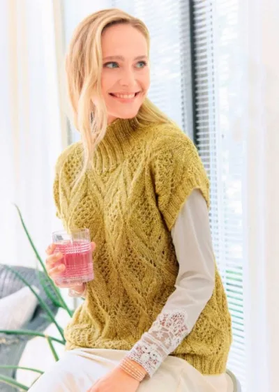 Вам потребуется: пряжа (70% вискозы, 30% шерсти; 150 м/50 г) — 250 (300) 350 г золотисто-желтой; спицы № 4,5 и 5,5; круговые спицы № 4,5.