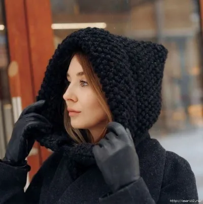 Простая и универсальная шапка-капюшон, которая вяжется спицами будет актуальна если не в этом году, так в том. Если кто еще хочет попробовать связать такую, то знакомьтесь с описанием.