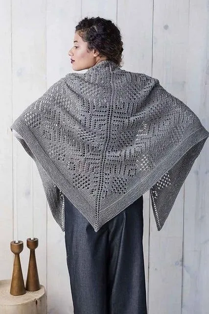 Ажурный рисунок шали разделен на две секции петлей лицевой глади по центру. С каждого края выполняются по 3 петли платочного рисунка.
