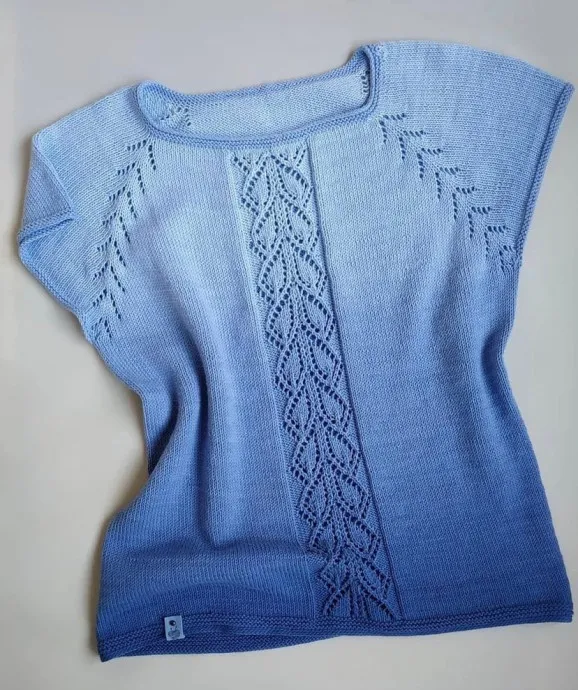Дальше вязала по кругу, на центральных петельках полочки ажурная вставка, схемка прилагается Вязала, вязала пока по спинке не стало 9 ажурных регланных «галочек», а по полочке 8 и….разделила «тушку» и рукава.