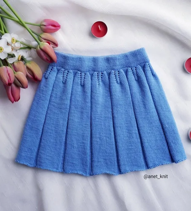 Далее вяжем по схеме и делаем прибавок столько сколько нужно, у меня их 6. Прибавки получатся за счёт накидов, которые одновременно образуют узор на кокетке юбочки. Когда ширина юбки достигнет нужного размера (обхват бедер ребёнка + добавка на свободное облегание) Прибавки делаем через ряд!!!
