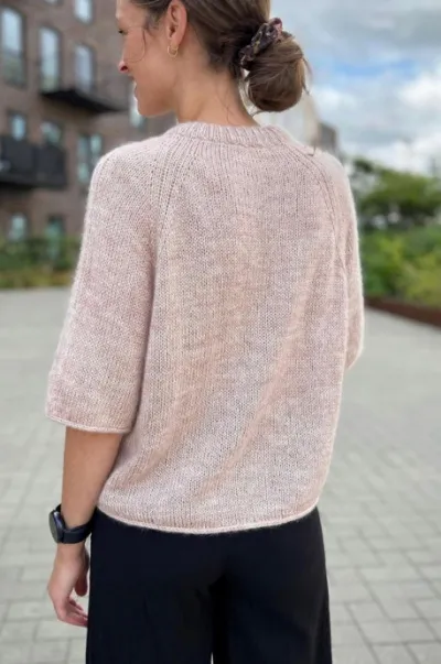 Корпус и рукава вяжутся круговыми рядами и заканчиваются полым шнуром. Для формирования нижнего края и небольшого удлинения спинки выполняется секция укороченных рядов.