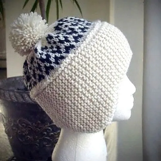 Теперь переходим к вывязыванию передней части шапочки. Далее провязываем оставшиеся 27 петель без прибавлений, платочной вязкой, не забывая выполнять узелковый край и серединку сгиб на этой полосе. Длина этой части шапочки равна 48 рядам (т. е. 24 "рёбрышка" по лицу и 24 "рёбрышка" по изнанке).