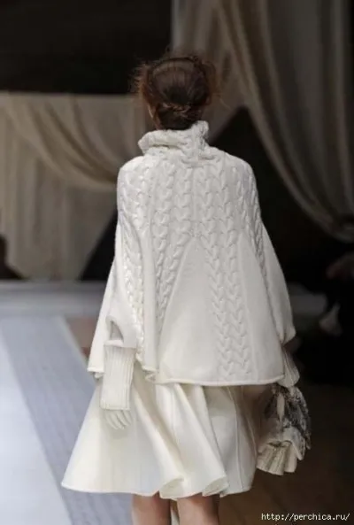 р. резинкой 2/2 и отложить петли. Выполнить боковые швы пончо. Пришить манжеты швом «петля в петлю», начиная и заканчивая на расстоянии 7/9 п. от каждого края узора с косами: 1-ю манжету по краю 1-й группы узора с косами, 2-ю - через 3 группы узора с косами. Сшить края манжет.