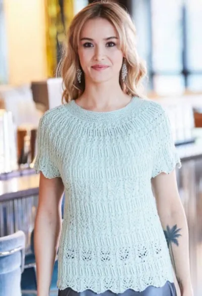 Узор 2: ажурный узор (число петель кратно 15) = вязать согласно схеме 1 круговыми рядами. На ней даны все круговые ряды. Постоянно повторять раппорт из 15 п. между стрелками.