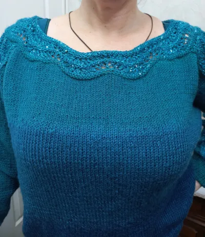 Хочу поделиться с вами моей новой работой джемпером цвета морской волны.Вязала по мастер - классу Юлии Имукиной джемпер "Династия". Я подписана на эту мастерицу, и эта модель мне очень понравилась, мастер - класс попетельный, вязалось на одном дыхании из остатков пряжи,что остались от моей работы кофты для мамы.Докупила нить с пайетками на Озоне, и взяла другой волнистый узор,а не как у Юлии в её работе.Ну не люблю я полностью копировать, решила своего добавить.И вот , что у меня получилось:
