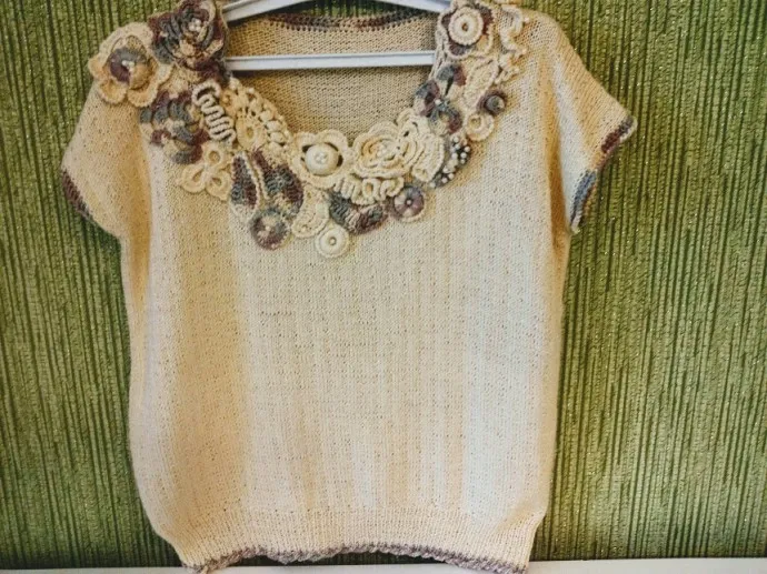 Вязала спицами №3, отделка крючком (элементы фриформ и ирландского кружева), бусины. Ушло 300 г YarnArt summer (70% хлопок 30% вискоза) и для отделки немного coco print. Блуза широкая с напуском… прям ретро )) связано два года назад.