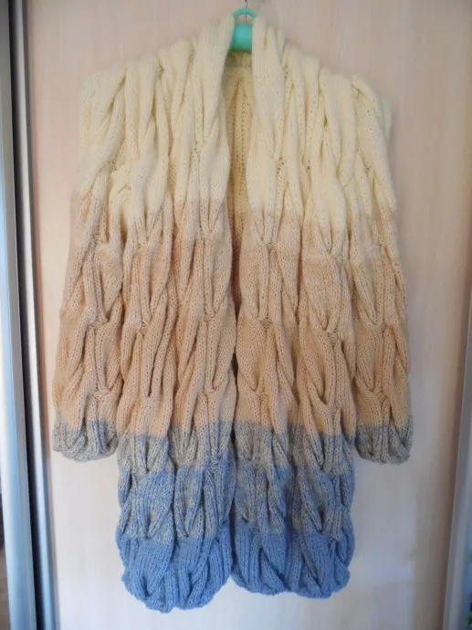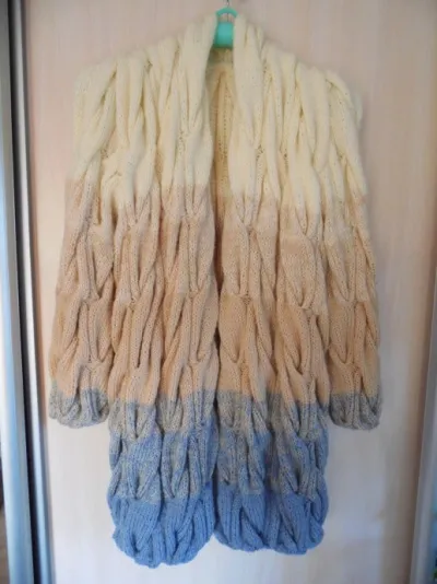 Для моего глаза, цвета не приемлемые. Эта Махина весит или около двух кг, или все два кг. Расход пряжи при градиенте очень не экономный. Для этой модели требуется очень высокая, очень худая женщина. Ну как говориться — " на вкус и цвет". // сама работа выполнена просто замечательно! Респект!