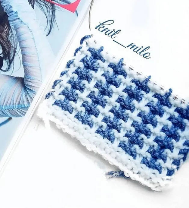 ⠀4 ряд - синей нитью: кром, 1 лиц, 1 петлю снимаем, нить за раб, *3 лиц, 1 снимаем, нить за раб, далее повторяем от * ещё 3 раза, кром