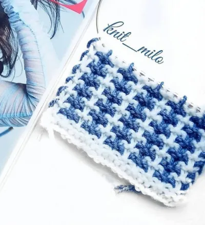 ⠀5 ряд синей нитью: кром, 1 п.снимаем нить перед раб,*3 лиц, 1 п. снимаем, нить перед раб, от * повторяем 4 раза, 1 лиц, кром
