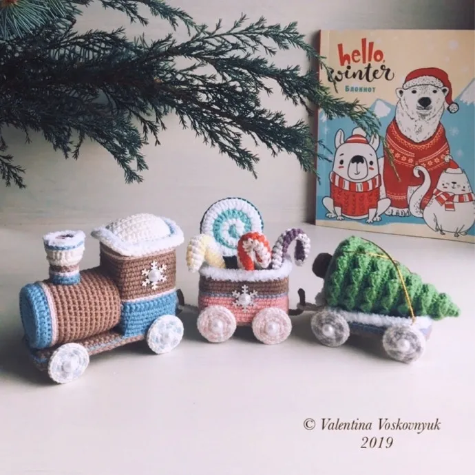 Можно связать маленькие подарочки из разноцветной пряжи и прикрепить их к паровозику. Или сделать огоньки из желтых ниток. Я люблю добавлять маленькие зеленые веточки елочки . Получается очень мило!