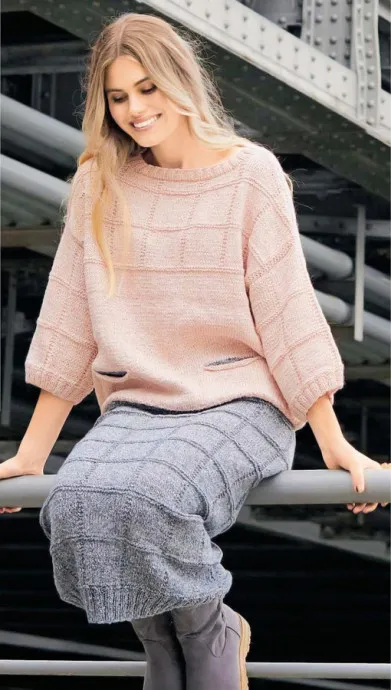 Свободный розовый джемпер квадратной формы с прорезными карманами, контрастными изнутри, хорошо сочетается с длинной узкой юбкой в графитовых тонах. Помимо прочего, эти модели объединяет клетчатый узор, представленный на рукавах и в верхней части пуловера, а на юбке – по всему полотну.