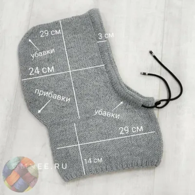 Ширина воротника 29 см (1/2), капюшона 24 (1/2)+3 см кулиска. Высота воротника 14 см, капюшона 29 см. Фото и описание.