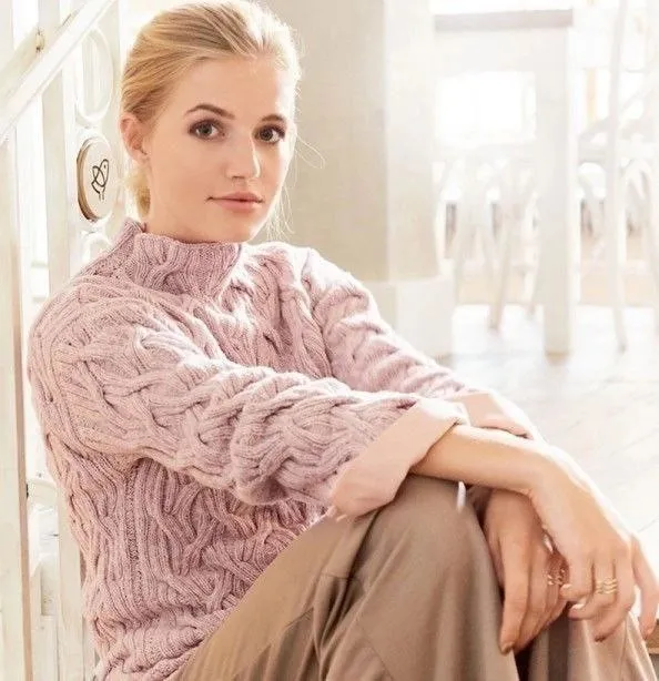 Вам потребуется: пряжа (80% овечьей шерсти, 10% кашемировой шерсти, 10% полиамида; 320 м/50 г) — 300 (350-400-450) г розовой; прямые спицы №4.