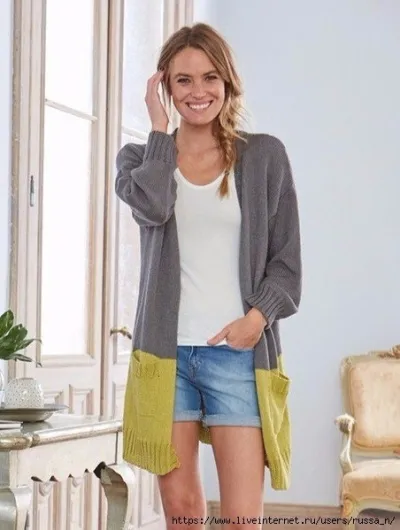 На спицы № 3 набрать анисовой нитью 56/60/64/68/72 п. и связать 22 р. (= 8 см) резинкой, при этом начинать между кром. в изн. р. с 1 изн. и заканчивать 3 изн., в лиц. р. начинать с 3 лиц. и заканчивать 1 лиц Затем перейти на спицы № 3,5 и вязать анисовой нитью лиц. гладью. Через 52 р. (= 18,5 см) от резинки начать выполнять следующим образом карман: провязать и отложить 11/13/15/17/19 п., для прорези кармана закрыть следующие 34 п., провязать и отложить следующие 11/13/15/17/19 п. По изнаночной стороне работы набрать на 32 р. (= 11.5 см) ниже закрытых петель 34 п. и связать 32 р. (= 11,5 см) лиц. гладью. Затем перевести на спицы отложенные с обеих сторон 11/13/15/17/19 п. полочки и продолжить вязать на всех 56/60/64/68/72 и. лиц. гладью.