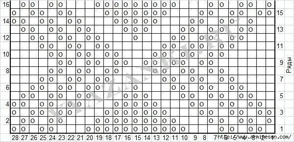 Число петель кратно 16 + 15 + 2 кром. п. Набрать 33 п. (7 + 16 + 8 + 2 кром. п.) и вязать согласно схеме, на которой приведены только лицевые ряды.В изнаночных рядах все петли вязать по рисунку, наки...