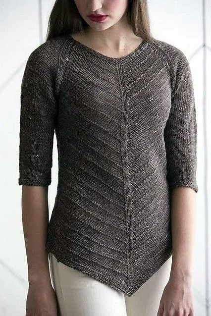 Стильная туника с креативным краем, хорошо подойдет к строгим брюк или обычных джинсов, согреет во время вечерней прогулки и усилит образ своей уникальностью. Изюминкой этого наряда является закостренний край и V-образный вырез.