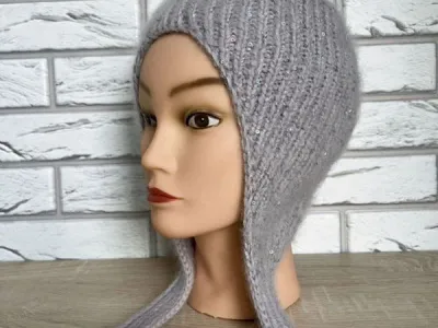 На этом этапе креплю нить с пайетками. Вывязываю петли ушка и затылочной части, прибавки в изнаночном ряду вяжу скрещенными