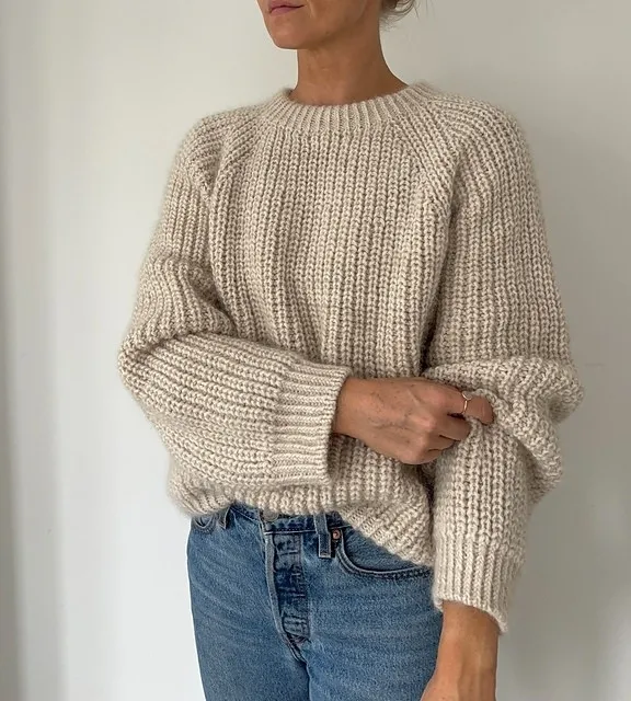 Свитер рассчитан на припуск около 32–36 см, то есть подразумевается, что он будет больше вашего обхвата груди на 32–36 см. Сначала вяжется горловина скрещенной резинкой и складывается пополам. Затем кокетка вяжется укороченными рядами, чтобы сформировать горловину, а оставшаяся часть вяжется по кругу с прибавками реглана.