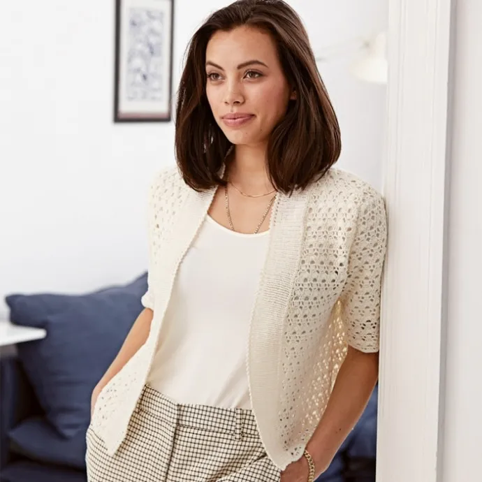 Основное полотно этого жакета с короткими рукавами выполняется крючком, а планки, имитирующие шалевый воротник, связаны на спицах.
