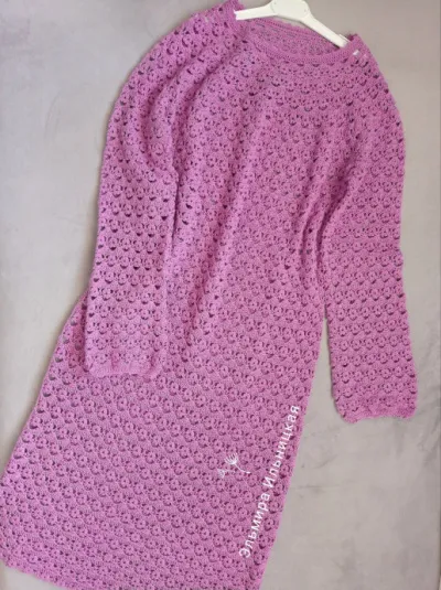 Вязаное крючком платье — это всегда про индивидуальность, а если оно выполнено в сиреневом цвете, да ещё и с круглой кокеткой, образ сразу становится мягким, женственным и очень выразительным.