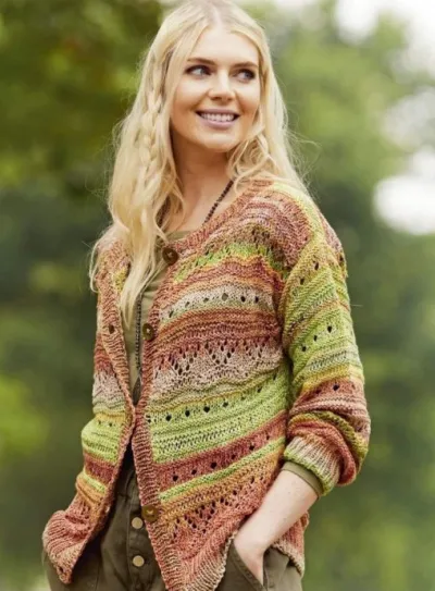 Вам потребуется: пряжа (65% хлопка, 25% вискозы; 105 м/50г) 400 (550) г зеленой оракжевой бежевой (пряжа с цве товыми переходами) спицы No 4,5; круговые спицы Ne 4,5,5 пуговиц.