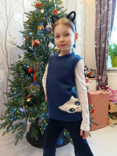 Всем добра и вдохновения! Внучка заказала жилет для школы, пришлось свою работу отложить, заказ внучки главнее. У них в школе жесткий дресс-код, можно только белый, синий, красный, а надо котика на жилетик посадить. Решили жилетик синий с белым котиком. Вот что получилось.