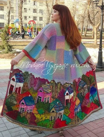 В технике интарсия можно вязать настоящие произведения искусства ,разные сложные узоры, менять цвет нити не только по горизонтали и вертикали, но и по диагоналям под разными углами.При чем обе нити при смене цвета перекрещивают на изнаночной стороне изделия, и при этом вязаное полотно остаётся таким же эластичным, как при вязании его обычной лицевой гладью.