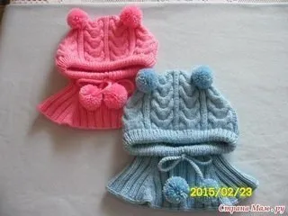 Начала вязать с резинки вокруг личика на круговых спицах, потом петли под подбородком отложила на булавку, далее вязала как чепчик или как пятку у носка, потом все петли вновь одела на круговые спицы, провязала 10 рядов резинкой и далее связала манишку. В резинку вокруг личика вставила шнурок. Шапочки получились очень удобные, подруги уже поделились впечатлениями.