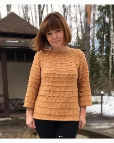 Уникальный джемпер, связанный спицами с рельефным горизонтальным узором, который создаёт эффект объёма и текстуры. Особенность модели — плавный переход узора от горловины к низу и рукавам три четверти, придающий изделию современный и стильный вид.